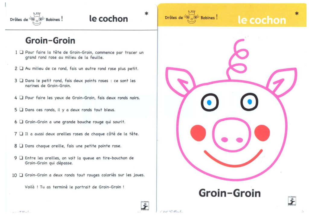 Prends une feuille blanche et demande à une personne qui sait lire de te dicter, étape par étape, ce que tu dois dessiner. Écris ensuite son nom en dessous et compare ton dessin avec le modèle!