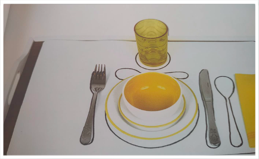 Tu peux demander à tes parents de te préparer un modèle avec le contour de la vaisselle et des couverts pour t’aider à trouver l’emplacement.