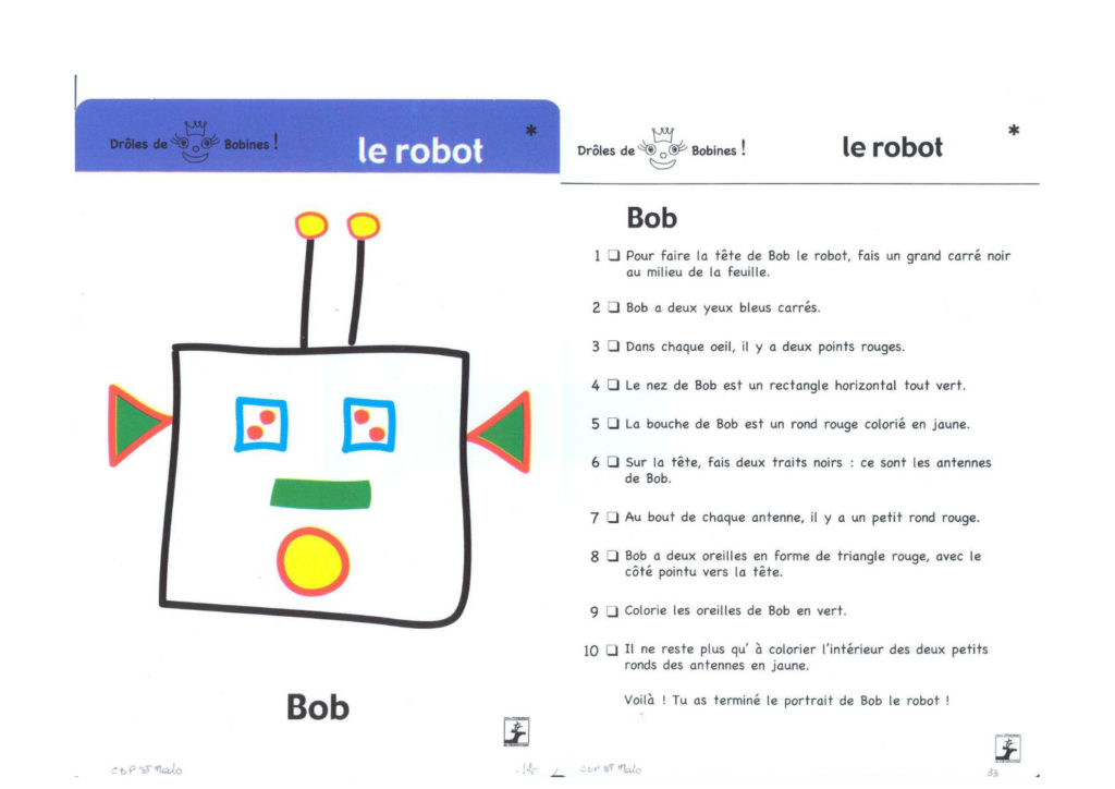 Prends une feuille blanche et demande à une personne qui sait lire de te dicter, étape par étape, ce que tu dois dessiner. Écris ensuite son nom en dessous et compare ton dessin avec le modèle!