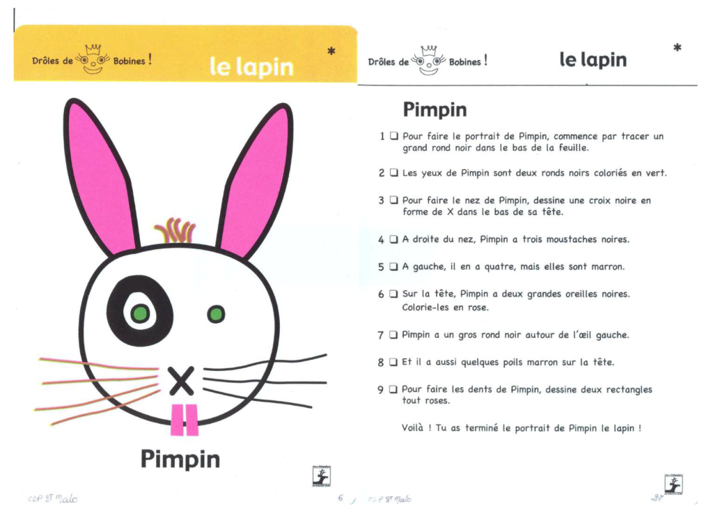 Prends une feuille blanche et demande à une personne qui sait lire de te dicter, étape par étape, ce que tu dois dessiner. Écris ensuite son nom en dessous et compare ton dessin avec le modèle!