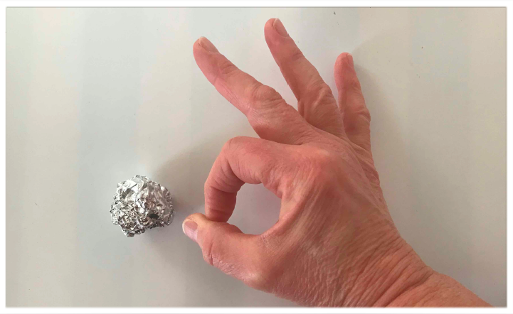 Prépare une petite boule de papier aluminium (ou papier journal). Regarde bien la photo ci-dessus, et entraîne-toi à tirer : tu dois relâcher ton index d’un coup brusque et rapide.